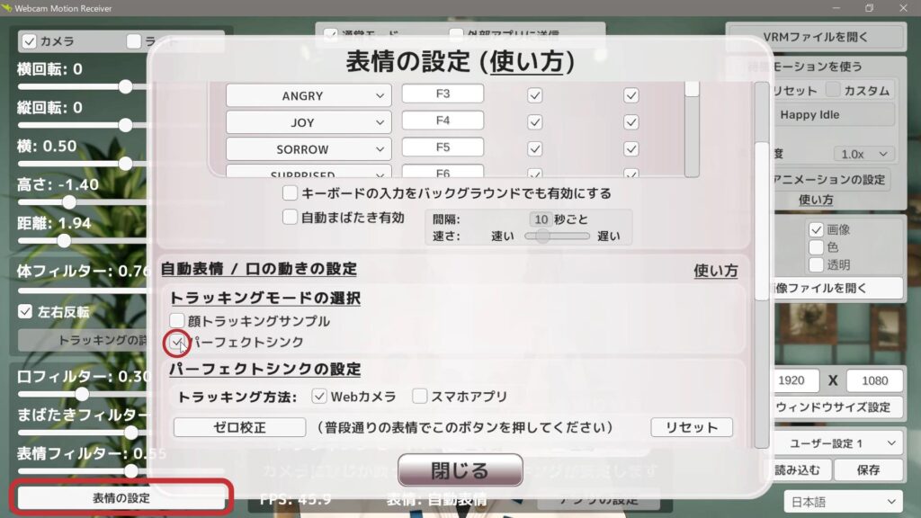 「表情の設定」をクリックし、トラッキングモードの選択でパーフェクトシンクをチェックします。