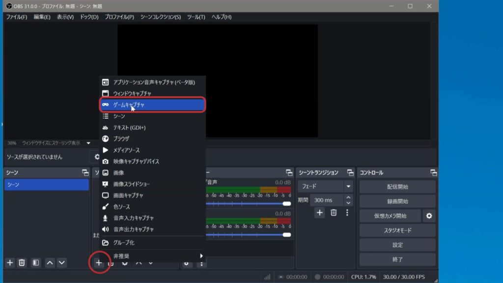 ①OBSの「ソース」の+ボタンをクリックし、ゲームキャプチャを選びOKをクリックします。