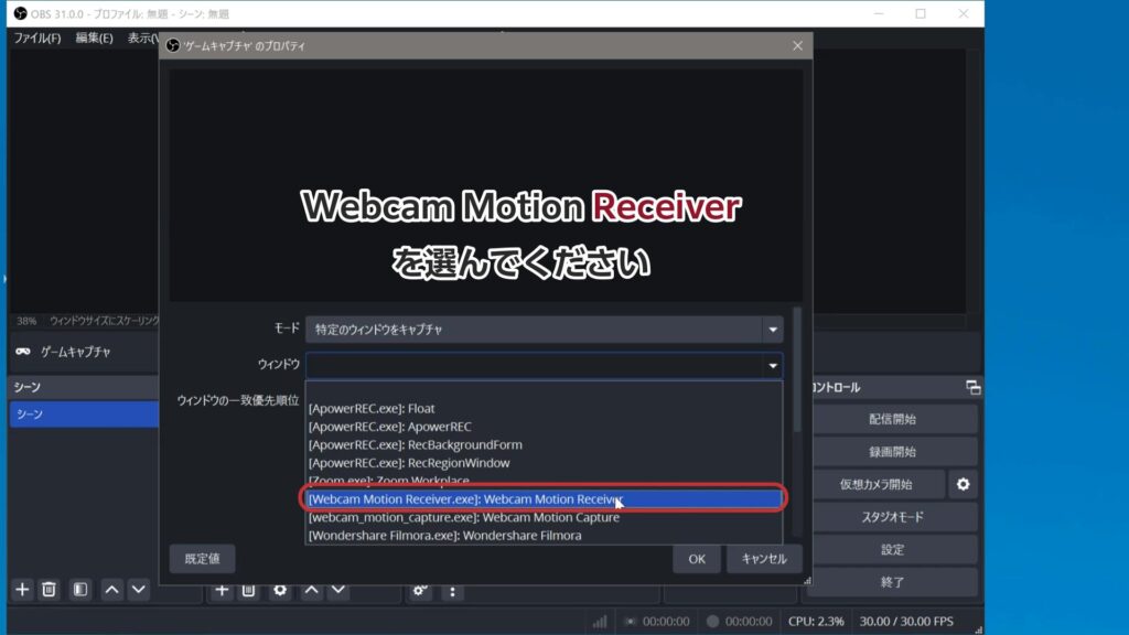 ③ウィンドウで「Webcam Motion Reciever」を選ぶと、キャラクターの画面が表示されるので、OKをクリック。