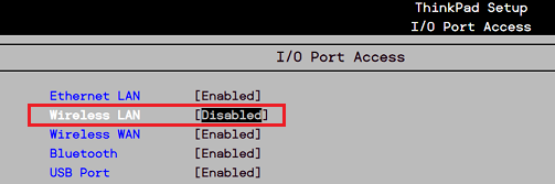 2.「Security -> I/O Port Access 」ページで、Wireless LANをいったん無効(Disabled)にし、すぐにまた有効(Enabled)に戻します。