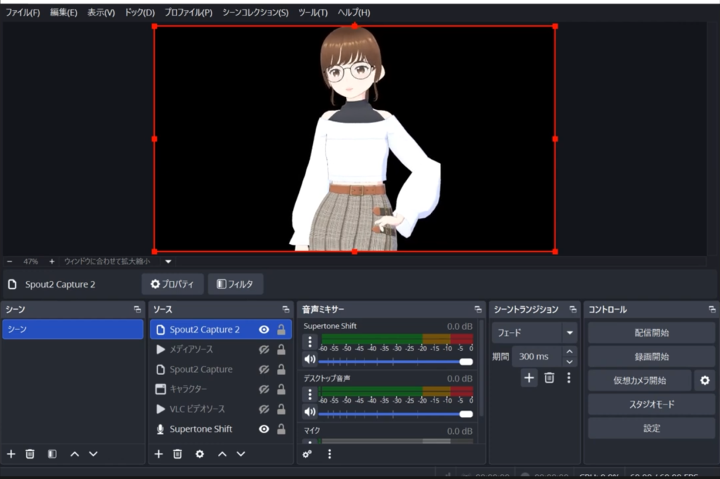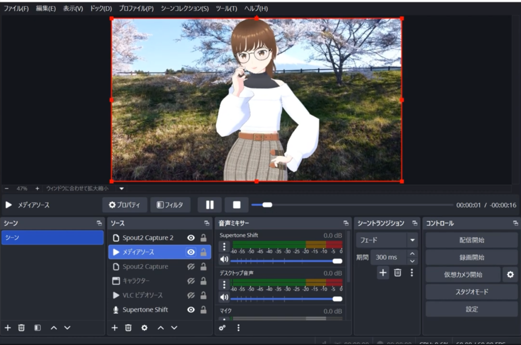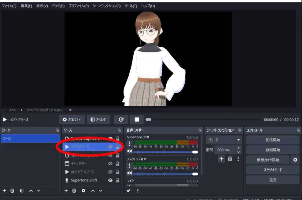 • この画面にはすでに「メディアソース」がありますが、これが映像のレイヤーになります。